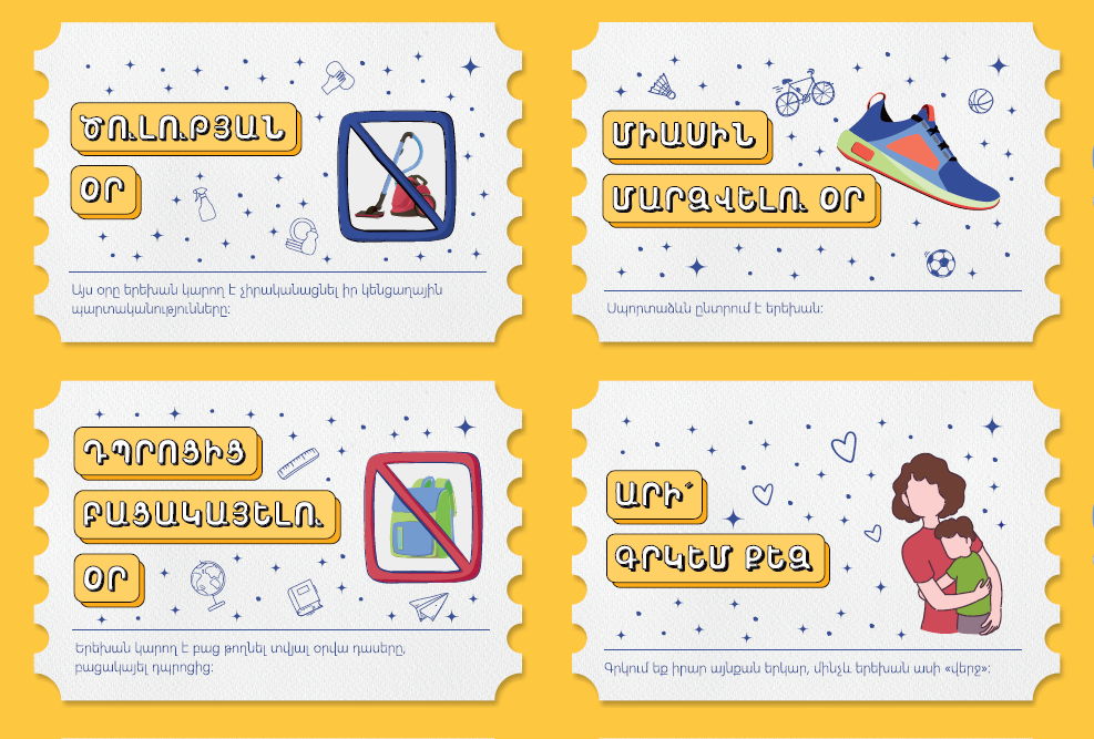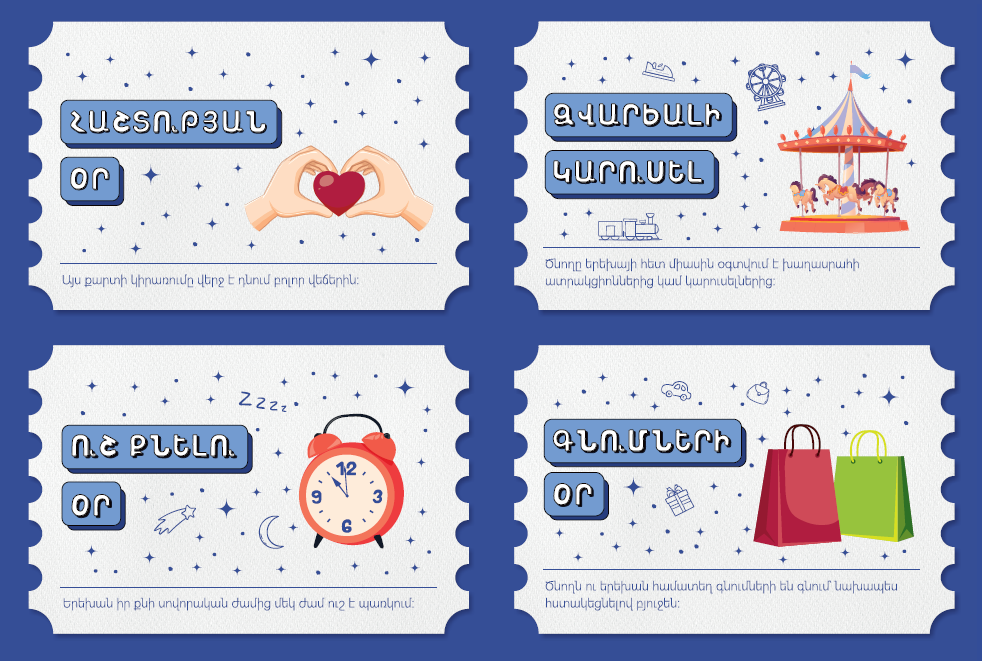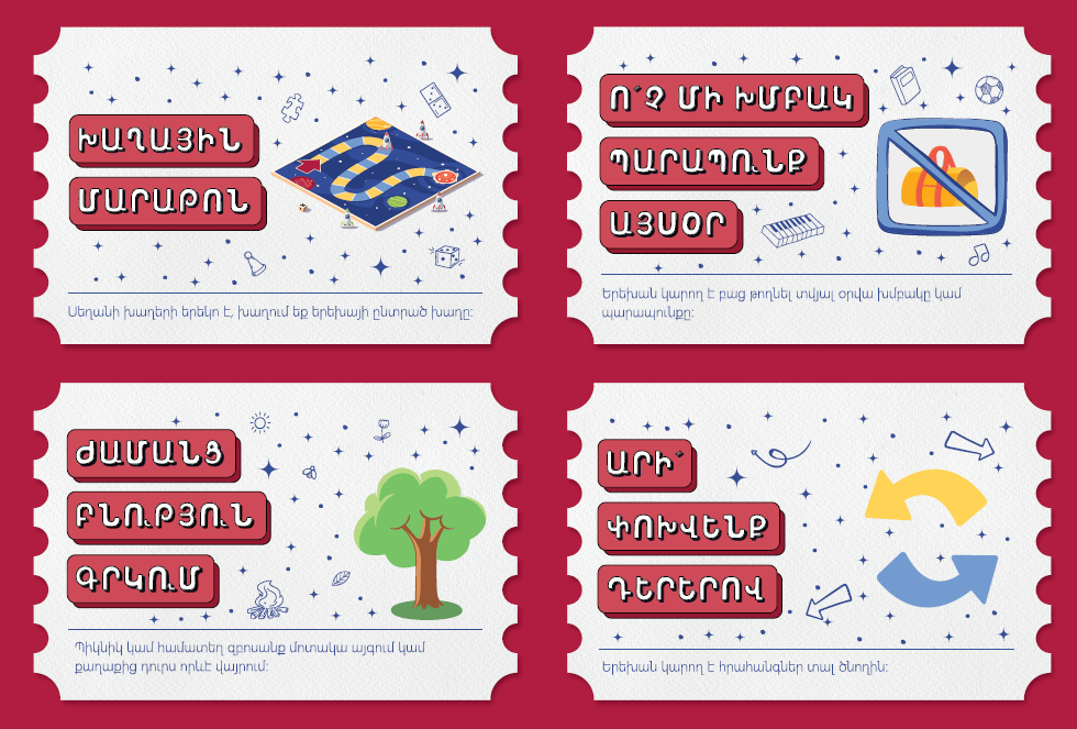 - Ընտրված քարտեր ցանկացած քանակով՝ շաբաթ-կիրակի իրականացնելու համար․ երեխան կարող է «ակտիվացնել» քարտերը միայն հանգստայն օրերին